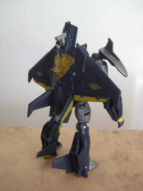 There is a thruster at the back, but you can clearly see the joints for his arms. For a Cybertronian mode, it's very good and looks plausible.