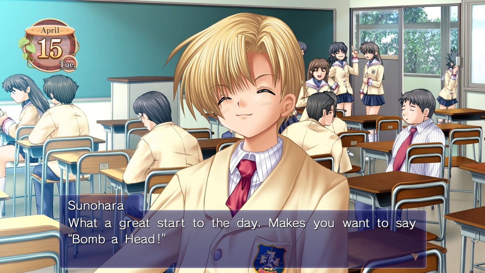 The player assumes the role of Okazaki Tomoya, a third year student at a high school. He is a delinquent, often skipping classes. His best friend (although he doesn't admit that) is Sunohara Youhei, a similar delinquent who manages to skip even more classes than him. Sunohara is the butt of many jokes, as he is not that smart and Tomoya takes heavy advantage of that. This leads to plenty of situations where Tomoya leads Sunohara to do and say stupid things, although if you think about it, what Tomoya is doing is effectively bullying. You can't help but feel sorry for Sunohara sometimes but it is just too funny.